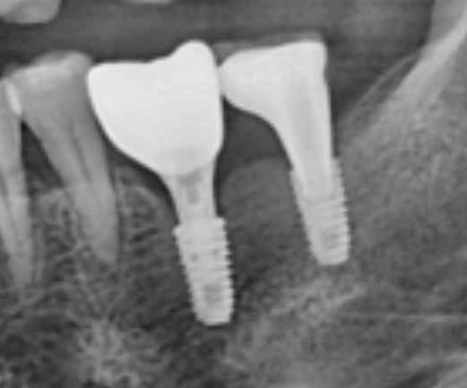 위 사진의 경우, 큰 어금니 2개가 상실되어 임플란트도 2개를 심어 회복한 모습입니다.