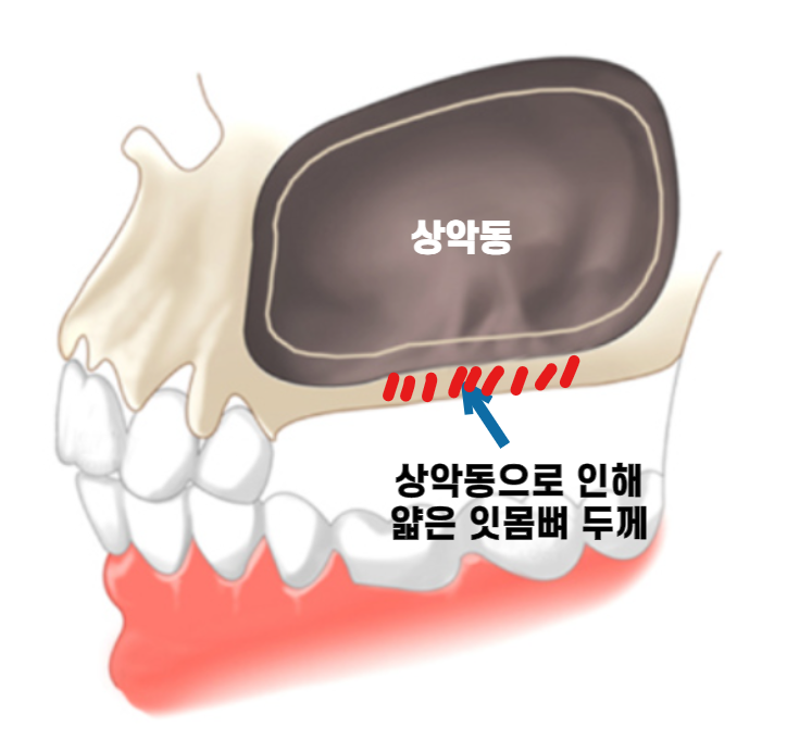 우리의 뺨 쪽에는 ‘상악동’이라는 빈 공기주머니가 존재합니다. 만약 상악동이 큰 편이거나, 치아가 빠진 채 오래 방치한다면 ‘상악동 함기화’가 진행되어 잇몸뼈가 더욱 얇아지는데요.